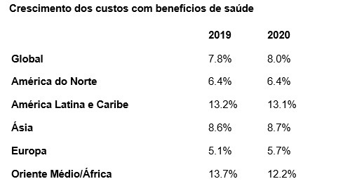 Globalmente, a tendência é que o aumento médio anual dos planos médicos financiados pelo empregador esteja em linha com o de 2019, com um crescimento de 0,2% em 2020, principalmente devido ao aumento de doenças crônicas, à expansão dos benefícios e ao ligeiro aumento previsto da inflação geral. O custo dos benefícios médicos oferecidos pelos empregadores deverá crescer até 8% em 2020, excedendo a inflação geral em 4,9 pontos percentuais.