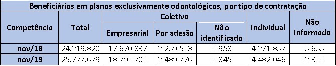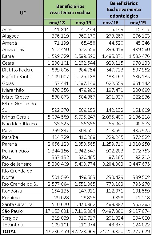 Já o segmento exclusivamente odontológico segue em sua trajetória de evolução nos últimos anos, contabilizando 25.777.679 usuários e crescimento de 1.557.859 em relação a novembro de 2018.