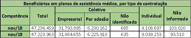 A Agência Nacional de Saúde Suplementar (ANS) divulgou nesta segunda-feira (06/01) os dados do setor de planos de saúde relativos ao mês de novembro. No período, o setor totalizou 47.223.963 beneficiários em planos de assistência médica em todo o Brasil, mantendo estabilidade em relação ao mesmo período de 2018 (47.236.459).