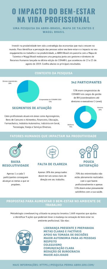 Estes são alguns dos resultados do estudo “O impacto do bem-estar na vida profissional”, feito com uma amostra representativa de 342 participantes e que identificou a percepção das pessoas sobre seu engajamento e produtividade no trabalho, realizado pela ABRH-Brasil em parceria com a Mapa de Talentos e a Waggl Brasil, e lançado na última edição do CONARH, que aconteceu de 13 a 15 de agosto de 2019.