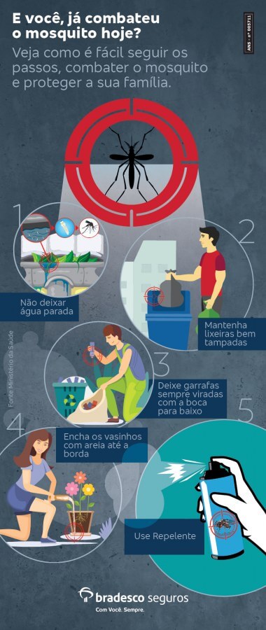 Para estimular a prevenção contra a proliferação do mosquito transmissor da dengue, a Bradesco Saúde lançou a campanha contra à doença, chamando atenção de seu público: “E você – já combateu o mosquito hoje?”. A cartilha traz cinco dicas práticas para proteger o ambiente de possíveis focos da doença.