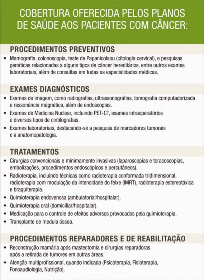 Cabe lembrar que os beneficiários de planos de assistência médica têm garantia de atendimento para uma série de exames e procedimentos dedicados ao cuidado oncológico, listados no Rol de Procedimentos e Eventos em Saúde da ANS – que determina a cobertura obrigatória pelos planos de saúde (veja no infográfico abaixo).
