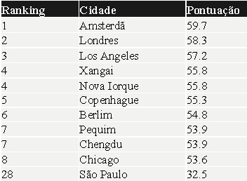 Índice Transforming Cities: este índice avalia quanto comportamento de mobilidade mudará em cada cidade nos próximos 10 anos. O ranking é baseado na mudança na proporção de viagens de carro, bicicleta, caminhada e transporte público. As cidades que apresentam o maior turno obtêm a pontuação mais alta, enquanto um índice de 100 representa a média global.