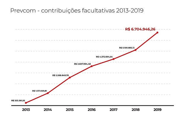 As contribuições voluntárias têm crescido todos os anos na Prevcom e a série histórica apurada pela entidade confirma esta tendência. No período de 2013 a 2019 os funcionários públicos transferiram o total de R$ 23,6 milhões em recursos extras para suas contas individuais. O comportamento dos participantes indica que, após 7 anos, os planos da entidade passaram a integrar o portfólio de investimentos dos servidores.