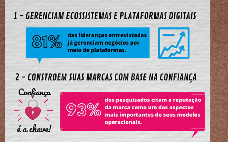 1) Orquestrar ecossistemas e plataformas digitais: Os líderes relatam que as plataformas digitais estão em ascensão, com a possibilidade de crescimento da receita e lucratividade para as empresas. 81% já são orquestradores de plataformas de negócios. Quando questionados sobre quais modelos comerciais e operacionais suas organizações estão adotando ou considerando para o futuro, a maioria dos entrevistados declarou sua intenção de atuar como integradores de recursos em uma cadeia de valor. A maioria das empresas concorda com a importância das plataformas de negócios para o futuro de suas organizações.