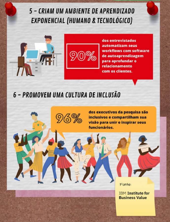 6) Promover uma cultura de inclusão: Por fim, as empresas líderes são inclusivas com seus funcionários, redes de parceiros e clientes e, ao mesmo tempo, geram experiências personalizadas para todos. Eles sabem que a diversidade da força de trabalho é chave. 96% dos principais executivos da amostra compartilham sua visão corporativa para unir e inspirar funcionários. Eles entendem que movimentos disruptivos só podem ser alcançados compartilhando uma visão forte, única e criando uma organização engajada e inspirada.