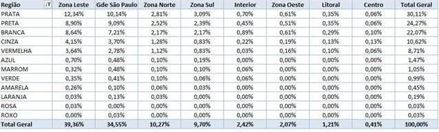 As cores Prata (30,11%), Preta (24,27%) e Branca (22,07%) são preferidas pelos bandidos durante o período. A cor Prata lidera o ranking em todas as zonas da capital e litoral. Gráfico 3.