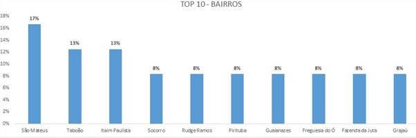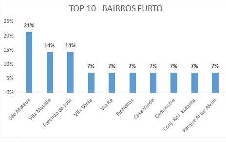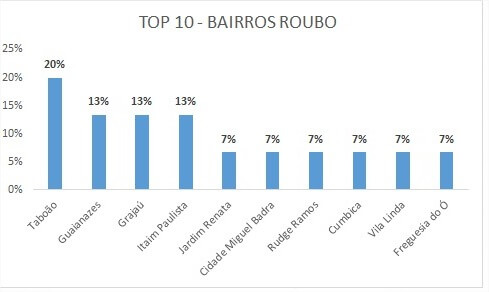 Os bairros de São Mateus (17%), Taboão da Serra (13%) e Itaim Paulista (13%) são os que registram o maior volume de furtos e roubos. Gráfico 4.