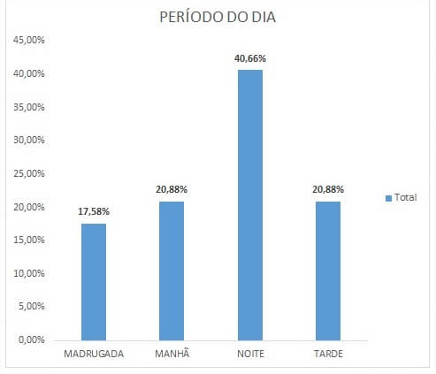Segundo o especialista, alguns equipamentos eletrônicos usados por bandidos possibilitam escapar dos rastreadores via satélite. “O nome do aparelhinho é jammer, mais conhecido como capetinha. Os criminosos compram o equipamento pela internet. Oficialmente, ele serve para bloquear o sinal de telefones celulares, mas os ladrões usam o aparelho para impedir que o sinal dos chegue até o satélite. Por isso, também utilizamos RF (Rádio Frequência), que o sinal não consegue ser inibido nas grandes metrópoles”, enfatizou Boutti. O levantamento mostra que 40,6% dos sinistros ocorrem no período da noite. Gráfico 7.