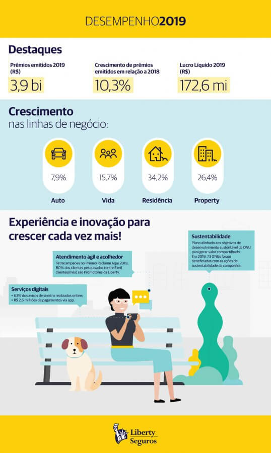 O Grupo Liberty Brasil, empresa parte do Grupo Liberty Mutual, um dos maiores conglomerados globais do setor de seguros, registrou um crescimento de 10.3% em prêmios emitidos em relação a 2018, atingindo um total de R$3.9 bilhões. A companhia alcançou lucro líquido de R$172 milhões e crescimento em todas as frentes de negócios: 34.2% em Residência, 26.4% em Property, 15.7% em Vida e 7.9% em Auto.