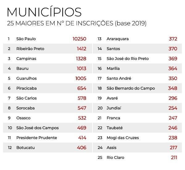 A Capital paulista, pelo conjunto de instituições e órgãos da administração pública instaladas no município, lidera o ranking de adesões com 10.250, seguida de Ribeirão Preto, com 1.412, Campinas, que registra 1328, Bauru, com 1013, e Guarulhos, onde residem 1005 servidores participantes dos planos da Fundação.