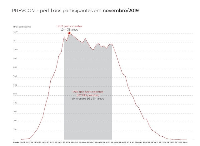 A classificação etária revela que a entidade mantém o total de 11.545 participantes com idades de 20 a 40 anos em seu sistema. A maior concentração é identificada na faixa de 41 a 60 anos que soma 19.797. A instituição registra o total de 3097 integrantes de 61 a 82 anos interessados em montar uma reserva que acrescente renda adicional à aposentadoria.