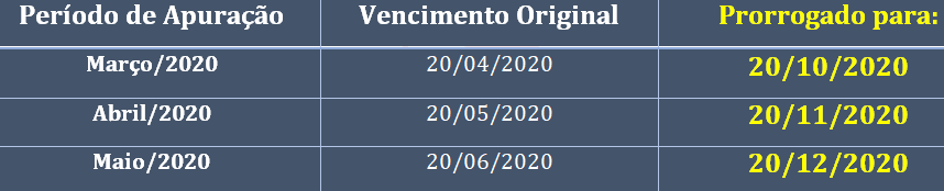 Em síntese, os tributos apurados em março, abril e maio deste ano - cujo pagamento ocorreria respectivamente no dia 20 do mês imediatamente subsequente - estão desde já adiados para serem recolhidos com carência de 6 meses, ou seja, na mesma ordem, serão recolhidos em outubro, novembro e dezembro. O quadro abaixo resume estes pagamentos: