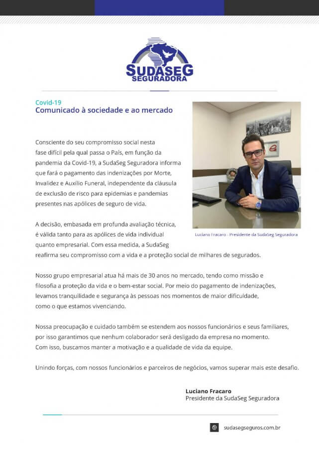 “Nosso grupo empresarial atua há mais de 30 anos no mercado, tendo como missão e filosofia a proteção da vida e o bem-estar social. Por meio do pagamento de indenizações, levamos tranquilidade e segurança às pessoas nos momentos de maior dificuldade, como o que estamos vivenciando”, afirma o presidente da SudaSeg, Luciano Fracaro.