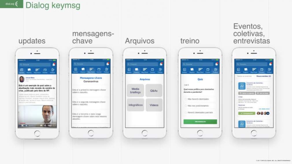 Mesmo com iniciativas para preservar a saúde e emprego de seus colaboradores, muitas empresas se veem obrigadas a tomar medidas impopulares a fim de preservarem, também, a saúde dos negócios. Para auxiliar as empresas a manterem uma comunicação clara e alinhamento de mensagens com seus colaboradores e também com a imprensa e o mercado, a startup Dialog.ci está disponibilizando a função gestão de crise em sua plataforma de comunicação interna, para que empresas comuniquem de forma ágil e estruturada a seus porta-vozes e até mesmo a colaboradores suas mensagens-chave, posicionamentos e respostas à perguntas frequentes. "No caso de uma crise tudo muda em questão de horas. Por isso, disponibilizamos uma versão do app e Web para lidar com este momento. Nele, é possível dar acesso a informações assertivas em tempo real, e inclusive testar o conhecimento e preparo de seus porta-vozes e colaboradores sobre o posicionamento da empresa com relação a temas sensíveis.", revela André Franco, CEO do Dialog.ci.