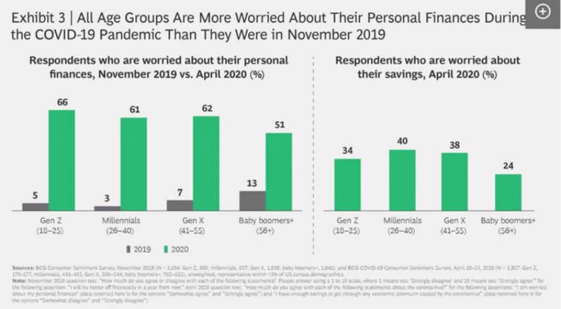 O consumidor norte-americano está mais preocupado com suas finanças pessoais no cenário de pandemia, revela nova pesquisa do Boston Consulting Group (BCG) sobre o comportamento do consumidor. A insegurança é percebida em especial na Geração Z. De acordo com o levantamento, 66% dos consumidores entre 18 e 25 anos responderam estar preocupados com a questão. Em novembro de 2019, esse índice era de 5%. A faixa etária com mais de 56 anos, por outro lado, aparenta estar mais segura a respeito de suas economias.