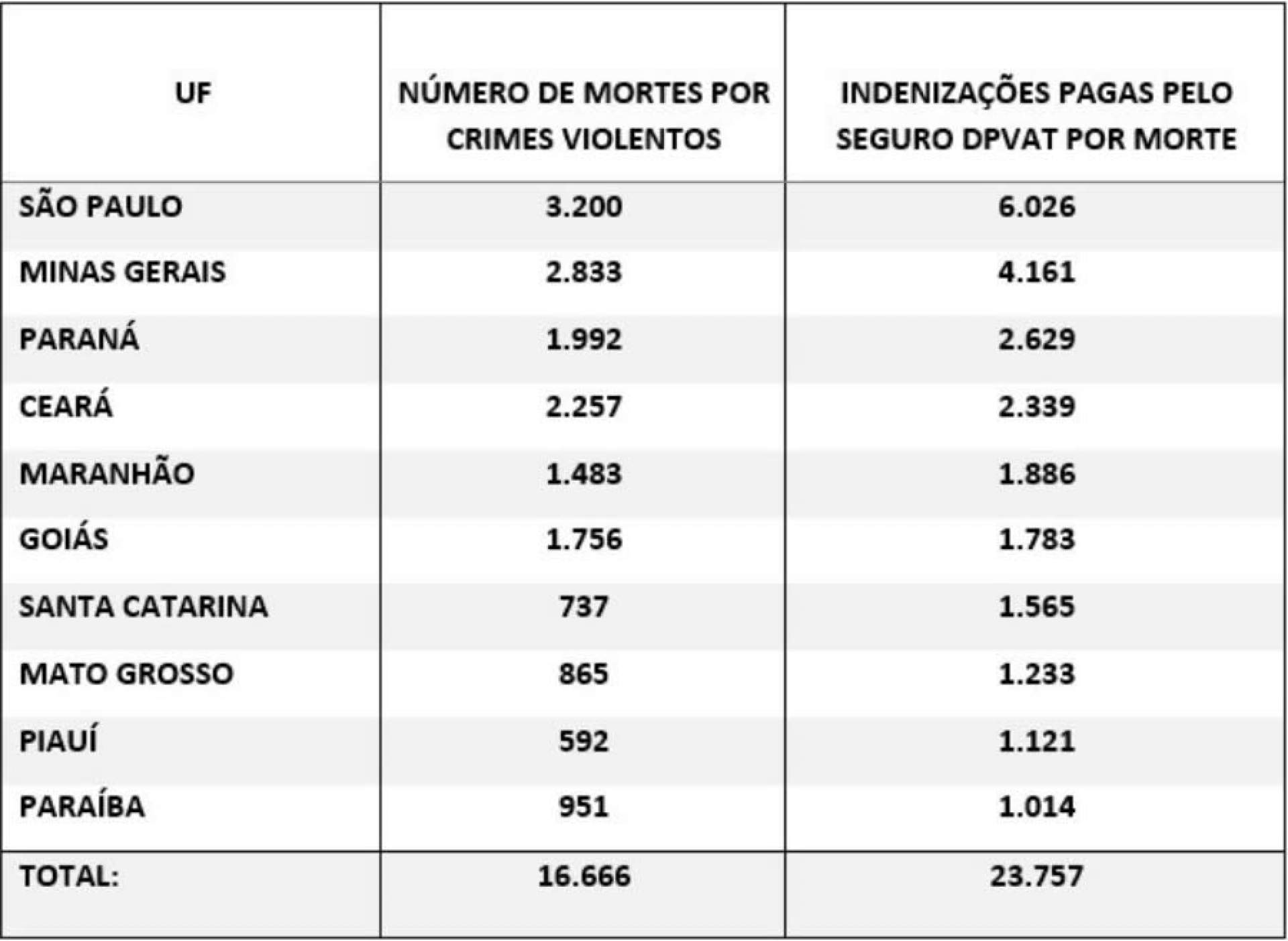 Um comparativo entre as indenizações pagas pelo Seguro DPVAT e os dados da Secretaria Nacional de Segurança Pública (Senasp), do Ministério da Justiça e Segurança Pública, mostra que, em 2019, dez estados somaram 23.757 pagamentos do Seguro DPVAT por acidentes fatais no trânsito. No mesmo período, os óbitos relacionados aos homicídios dolosos, latrocínios e lesões corporais seguidas de morte totalizaram 16.666 mortes.