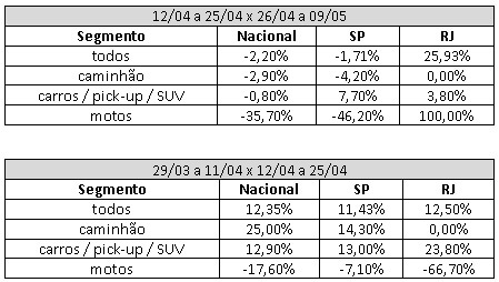 Já o Estado do Rio de Janeiro registrou alta no índice de roubo e furto pela segunda quinzena consecutiva. A alta global foi de 25,93%. O segmento caminhões permaneceu estável e motos registraram crescimento de 100% nas ocorrências.
