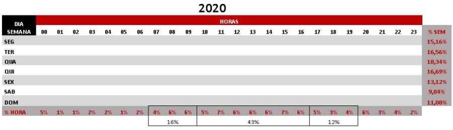 Mudança também na preferência do dia da semana para agir. Entre 15 de março e 10 de maio de 2019, de cada 10 eventos, três eram na sexta-feira. Durante a quarentena esse índice caiu para 13,12%. Sábado que registrou 17,07% dos eventos em 2019, durante a quarentena representa 9,04%. “Não percebemos uma variação significativa nos horários das ocorrências. Durante a pandemia 16% delas são entre 7h e 9h da manhã, 43% entre 10h e 16h, 12% entre 17h e 19h e os outros 29% são entre 20h e 6h da manhã. Nas outras semanas correspondentes de 2019 foram registrados 13% dos roubos e furtos entre 7h e 9h da manhã, 37% entre 10h e 16h, 14% entre 17h e 19h e os 36% restantes entre 20h e 6h da manhã”, conta Correa.