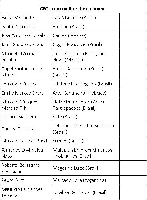 A Institutional Investor publicou os vencedores de uma análise feita com mais de 600 analistas de carteira, gestores financeiros e analistas de mercado na pesquisa Equipe Executiva América Latina. A pesquisa nomeou os melhores diretores executivos, diretores financeiros e profissionais de Relações com Investidores em 16 setores de negócios da região.