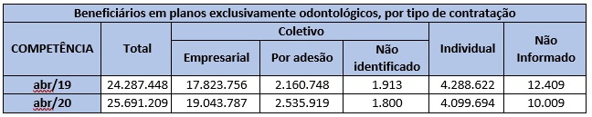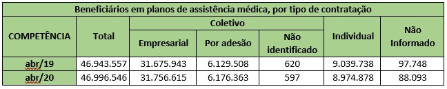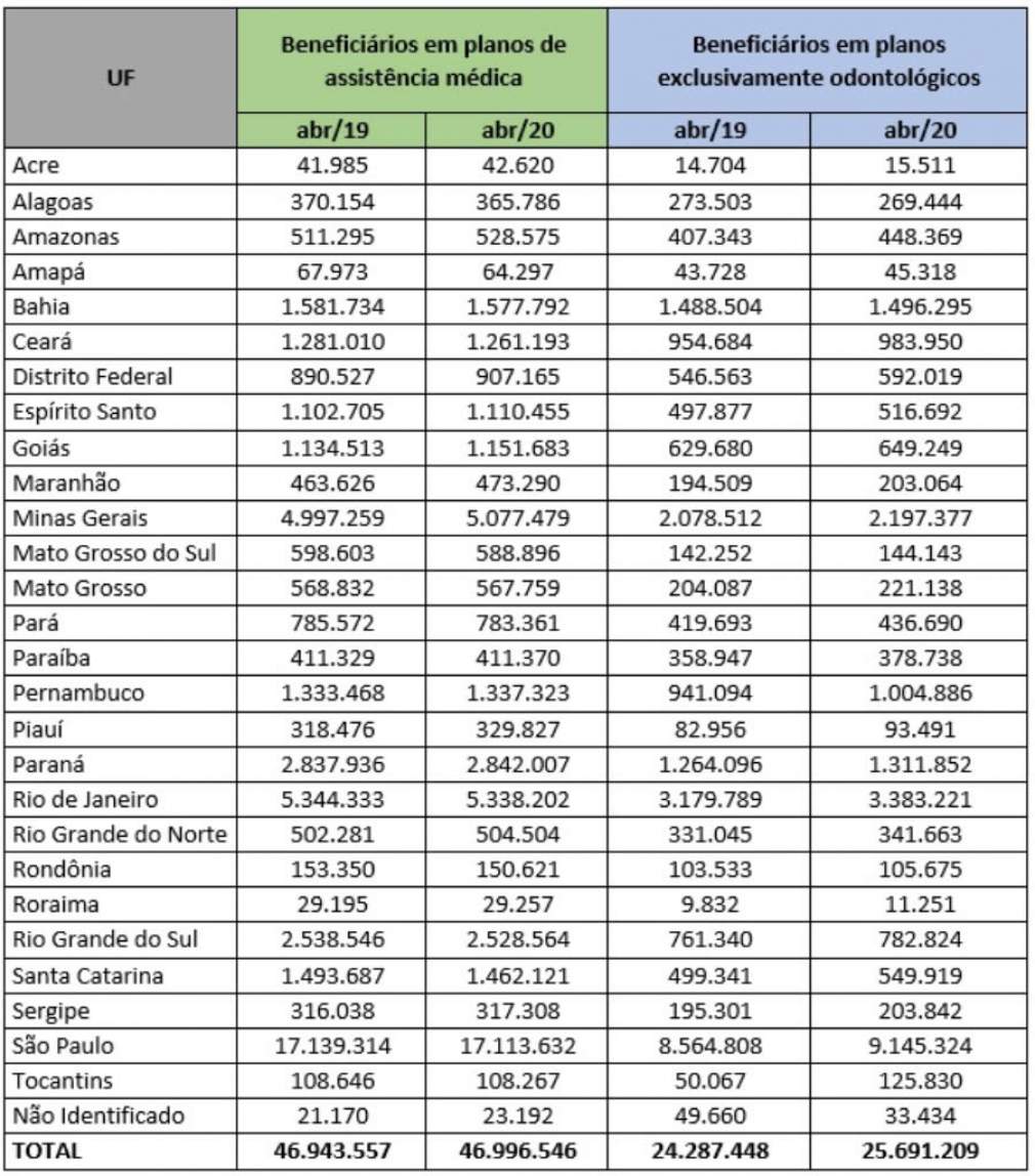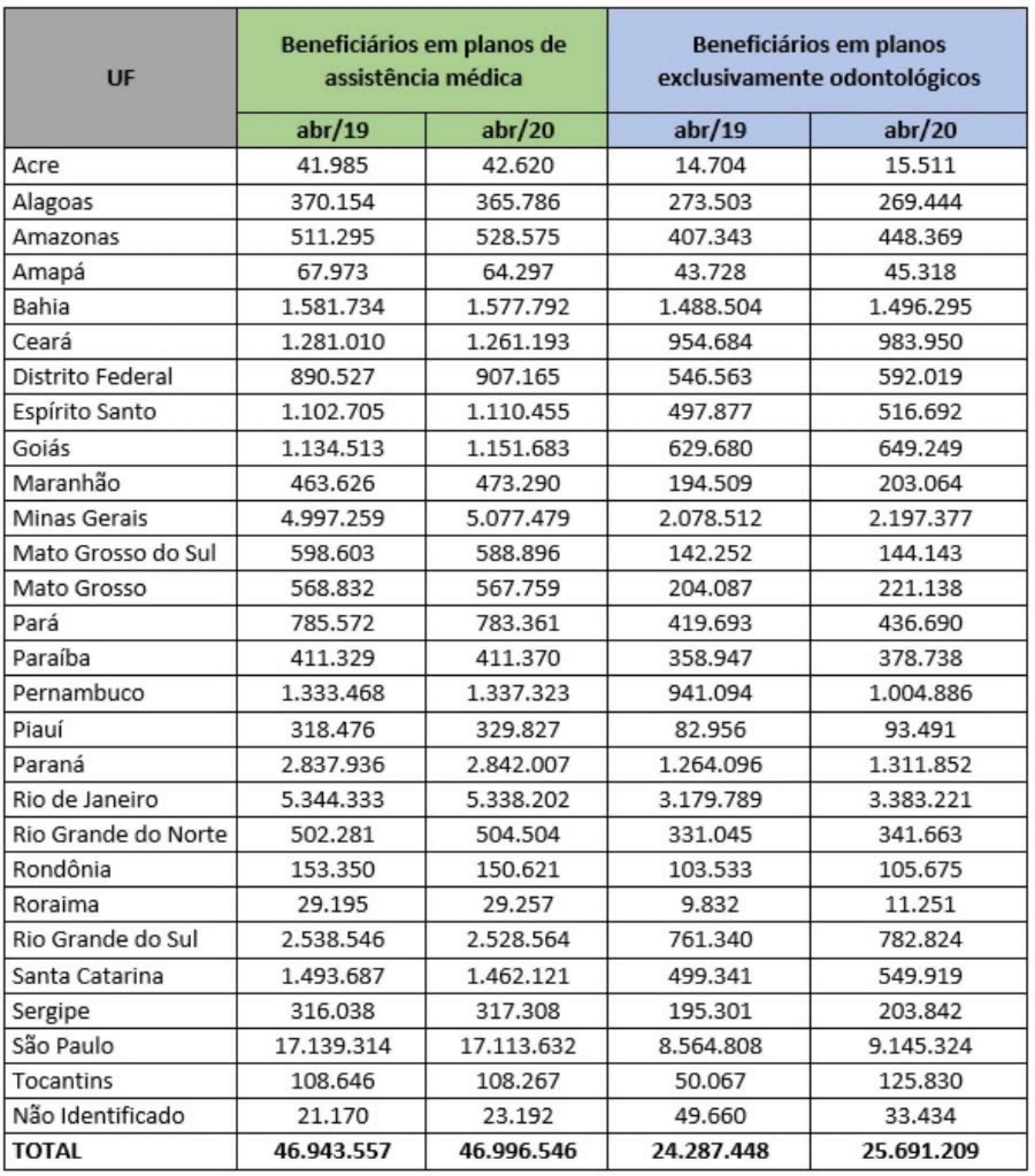 Em abril de 2020, o setor totalizou 46.996.546 beneficiários em planos de assistência médica em todo o Brasil, mantendo a tendência de estabilidade, com pequenas oscilações em relação a períodos anteriores. O segmento exclusivamente odontológico totalizou 25.691.209 beneficiários.