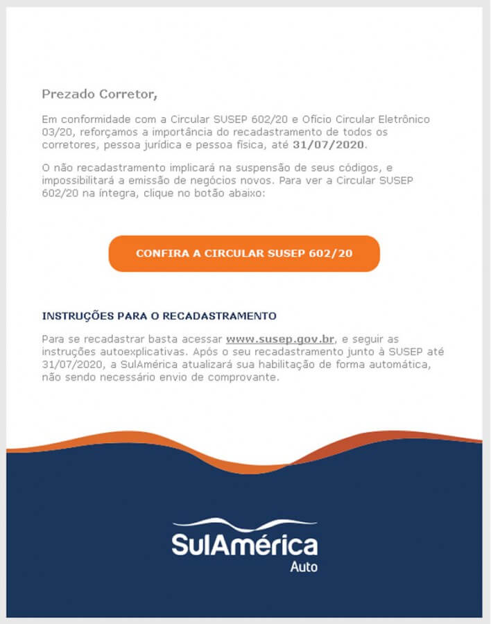 Recebi com bom grado o e-mail da Sul América em propagar o recadastramento. Mostrando que as seguradoras estão fazendo tudo para que o corretor mantenha seu cadastro em dia.