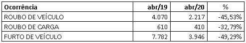 O Boletim mostra ainda que no mês mais crítico da pandemia – abril – a queda foi ainda mais expressiva, redução de 45,53% no número de roubo de veículos, 32,79% nos roubos de cargas e 49,29% nas ocorrências de furto de veículos, na comparação com abril de 2019.