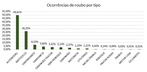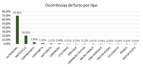 Já as ocorrências de furto somaram 23.775 boletins, nos quatro primeiros meses do ano. 69,86% eram automóveis, 20,63% motocicletas e 3,90% caminhonetes.