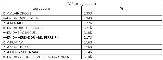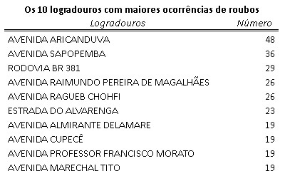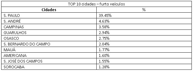 As dez cidades recordistas de ocorrências de roubos foram São Paulo (42,66%), Campinas (5,33%), Guarulhos (4,18%), São Bernardo do Campo (2,92%), Santo André (2,79%), Diadema (2,74%), Mauá (1,97%), Osasco (1,64%), Itaquaquecetuba (1,55%) e Suzano (1,35%).