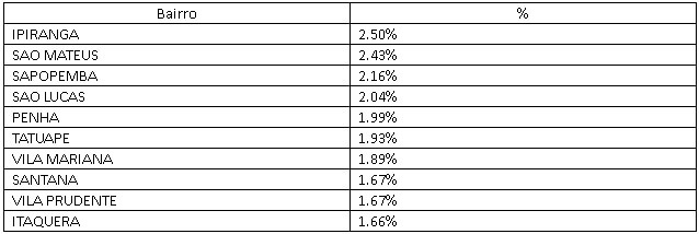 Na capital paulista, os bairros mais violentos foram: Sacomã (2,89%), São Mateus (2,70%), Iguatemi (2,44%), Ipiranga (2,44%), Itaquera (2,32%), Cidade Ademar (2,21%), Jardim Colina (2,09%), Sapopemba (1,99%), Jabaquara (1,95%) e Itaim Paulista (1,93%). A maioria dos bairros se encontra na Zona Leste e Zona Sul.