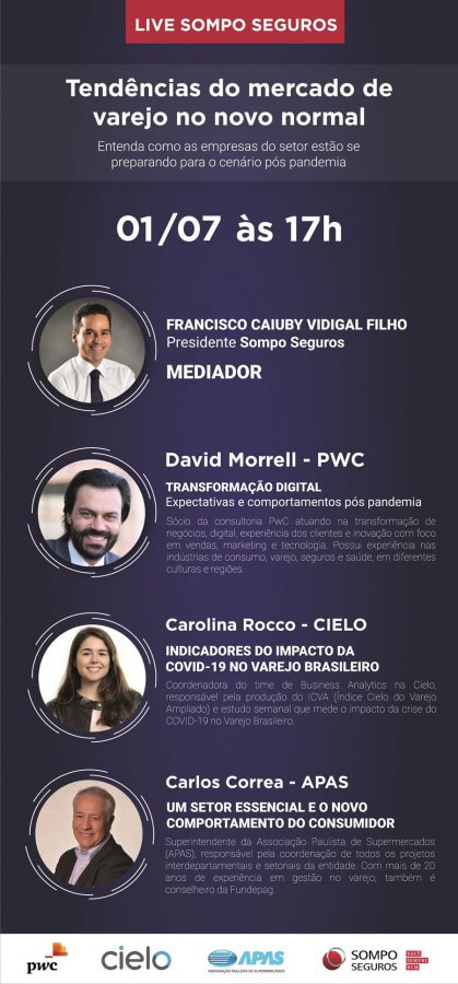 Na ocasião, especialistas da consultoria PwC, Cielo e Associação Paulista de Supermercados (APAS) abordam as Tendências do mercado de varejo no novo normal - Entenda como as empresas do setor estão se preparando para o cenário pós-pandemia. O evento online e gratuito vai contar com a mediação de Francisco Caiuby Vidigal Filho, presidente da Sompo Seguros. Para participar, basta acessar o link https://bit.ly/SompoLvVarejo na data e horário agendados.