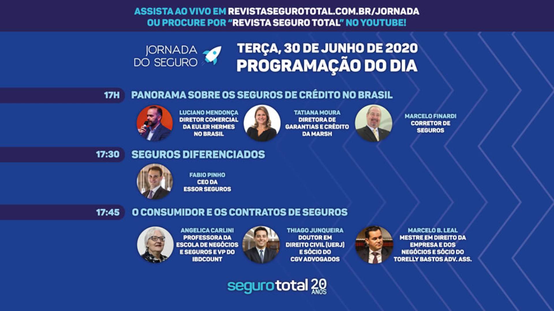 O primeiro painel, que será transmitido a partir das 17h desta terça, conta com a presença de Luciano Mendonça, Diretor Comercial da Euler Hermes no Brasil; Tatiana Moura, Diretora de Garantias e Crédito da Marsh; Marcelo Finardi, Corretor de Seguros e Especialista em Seguros de Crédito. A partir das 17h30min será apresentada uma entrevista especial sobre Seguros Diferenciados com Fabio Pinho, CEO da Essor Seguros.