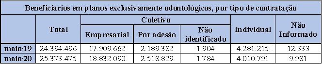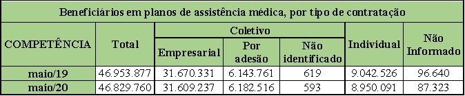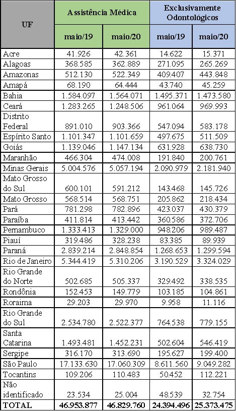 Em maio de 2020, o setor totalizou 46.829.760 usuários na segmentação de assistência médica e 25.373.475 na segmentação exclusivamente odontológica em todo o Brasil. No geral, o setor manteve a tendência de estabilidade, com pequenas oscilações em relação aos meses anteriores.