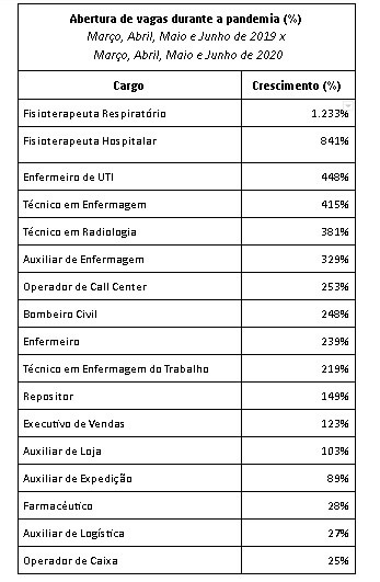 Ainda liderando o levantamento, está o fisioterapeuta respiratório, profissional à frente das UTIs e responsável pelo manuseio de ventiladores mecânicos, auxílio e preparo de intubação de pacientes, com crescimento de mais de 1.233%. Ainda na área da saúde, profissionais como fisioterapeuta hospitalar (841%), enfermeiro de UTI (448%), técnico em enfermagem (415%) e técnico em radiologia (381%) são os cargos de maior crescimento desde o início da implementação da quarentena.