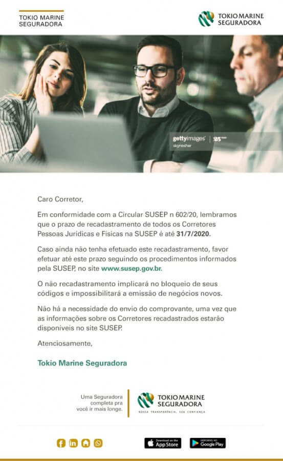 Mas as seguradoras também estão fazendo o papel correto. Todos os dias eu recebo os alertas do final do recadastramento. Uma sugestão seria promover apresentações ao vivo, explicativas e que tirassem as dúvidas dos angariadores. Visto o acompanhamento dos gerentes regionais sobre corretores ainda não recadastrados e, talvez, uma visitinha online para ajuda-lo a cumprir a missão. Como exemplo eu deixo aqui o chamado bem apresentado da Tokio Marine.