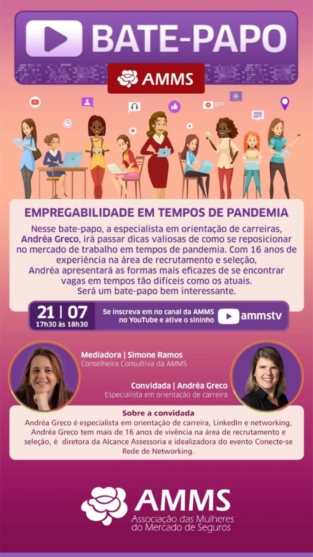 A AMMS promove nesta terça-feira (21 de julho), das 17h30 às 18h30, bate papo virtual sobre o tema "Empregabilidade em Tempos de Pandemia".