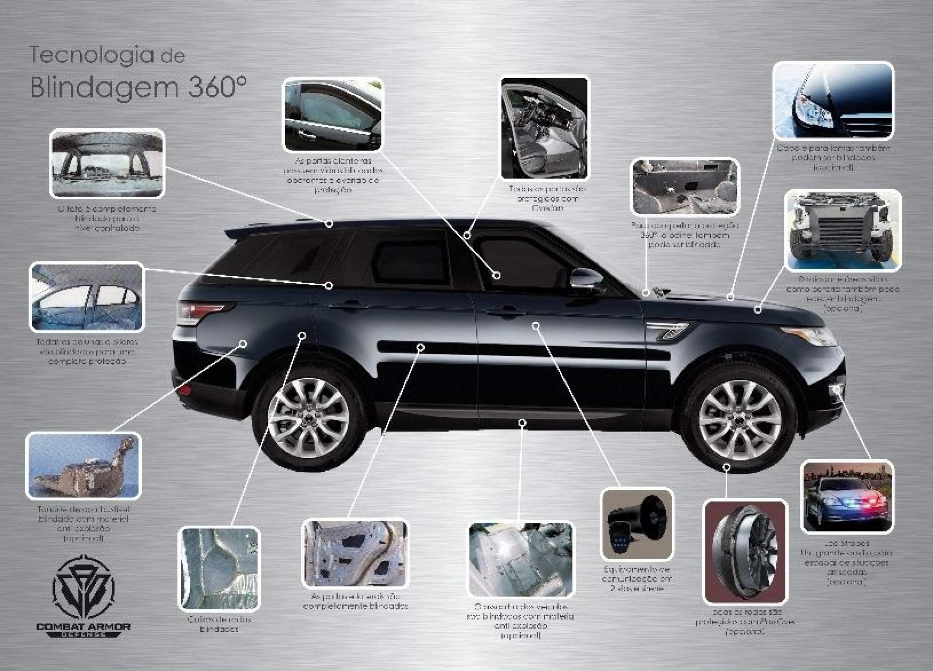 A empresa desenvolveu a Blindagem 360° para nível IIIA (armas de mão), conforme normas internacionais, que protege todos os pontos vulneráveis (gaps) do veículo. A Blindagem 360° garante 100% de proteção, selando totalmente o habitáculo do veículo. Diferentemente das blindagens atuais, possui algumas características importantes: a blindagem do painel frontal, teto, Overlap de porta e de carroceria, reforço nas dobradiças de porta e reforço da suspenção. "A tecnologia oferece total segurança, ao mesmo tempo em que proporciona leveza ao veículo", diz Johanan Castellano, diretor corporativo da Combat Armor Defense do Brasil.