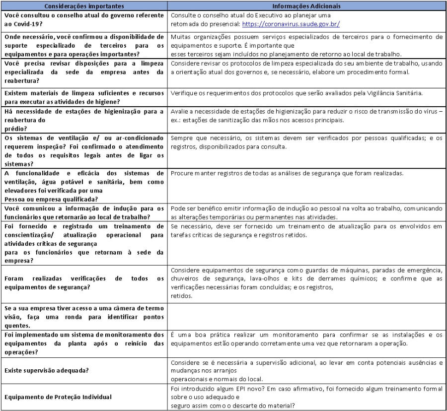 No checklist elaborado pela seguradora, há elementos-chave que devem ser levados em consideração para que a volta seja segura, com as precauções necessárias. Para Cortés, ter um planejamento estratégico é vital para que as atividades de trabalho sejam retomadas de forma gradativa, seguindo todos protocolos de saúde pública local e internacional.