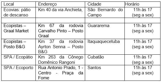 Com o objetivo de apoiar o trabalho dos motoristas de caminhão, que exercem funções essenciais à população, o Grupo EcoRodovias, o Programa Todos pela Saúde, iniciativa do Itaú Unibanco, e a Porto Seguro estão realizando testes gratuitos para identificação do novo coronavírus (Covid-19) — dos tipos sorológico e também PCR — e aplicando vacinas contra a gripe influenza (H1N1) em cinco pontos de fácil acesso para os caminhoneiros nas cidades de São Bernardo do Campo, Guararema, Itaquaquecetuba, Cubatão e Santos. Confira abaixo: