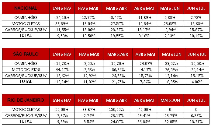 Quando começou a pandemia, em março, a queda nas ocorrências, foi de 10,5%, em relação a fevereiro. Em abril caiu 19,55% em relação ao mês anterior. Já em maio houve alta de 8,18%, frente a abril. Em junho cresceu 2,13% e julho apresentou nova alta, de 10,19%. O segmento de caminhões foi o que sofreu a menor variação durante todo o primeiro semestre. “Esse foi o único setor que não teve diminuição de demanda em toda a economia, pelo contrário, as vendas online aumentaram, sem contar que as pessoas na quarentena elevaram o consumo de forma remota de alimentos, produtos de higiene, de informática, entre outros, e os caminhões permaneceram circulando pelas ruas e estradas”, afirma o diretor Comercial do Grupo Tracker, Rodrigo Abbud.
