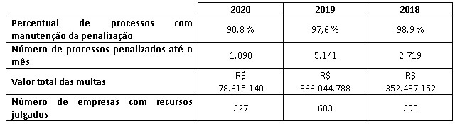 Em relação ao número de empresas que tiveram mantidas suas autuações registramos 2020/2019 - 46% - e 2020/2018 – 16% - (redução menor)