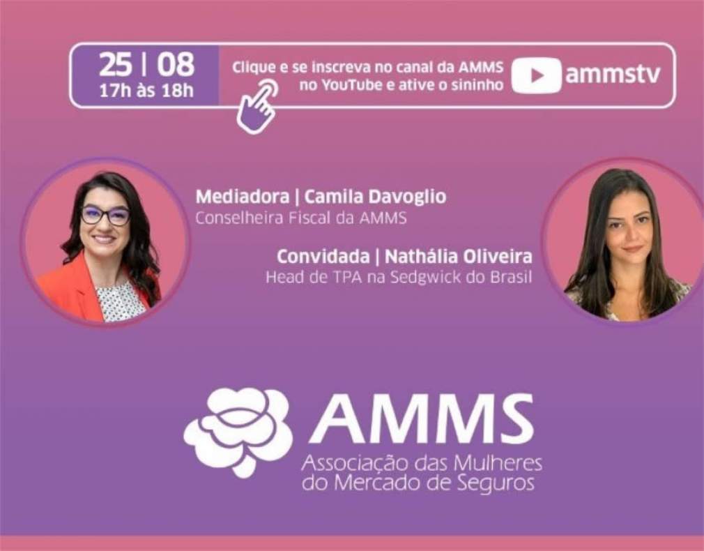 Executivas do mercado de seguros, Nathalia Oliveira (convidada) e Camila Davoglio (mediadora) participam do “bate-papo” que a AMMS promove nesta terça-feira (25 de agosto), das 17 às 18 horas, no canal da Associação no Youtube.