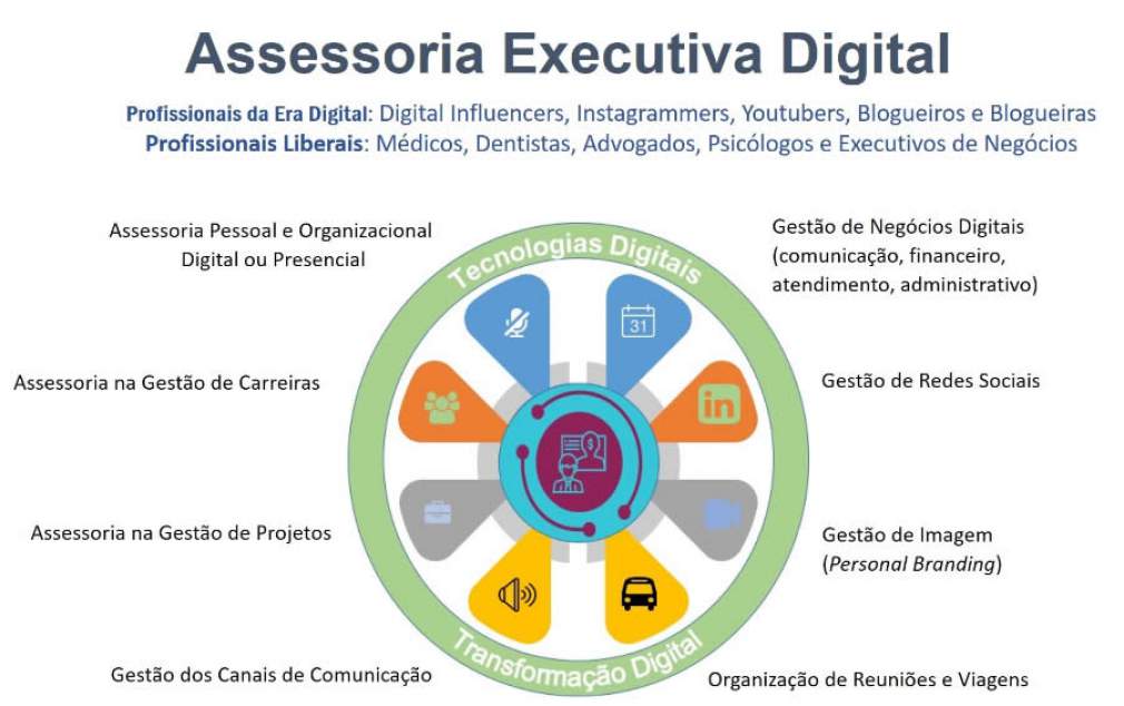 Nas empresas e nas sociedades contemporâneas, o trabalho, o relacionamento e o comércio virtual, surgem como um novo espaço de trabalho, de convivência e como uma oportunidade de negócio. O profissional de Assessoria Executiva Digital se configura, neste contexto, como um profissional dinâmico, atualizado e com domínio de ferramentas digitais que oportunizam a assessoria virtual, a gestão de negócios digitais e tradicionais e o desenvolvimento de outras atividades voltadas para pessoas e negócios com atividades no ciberespaço, como a gestão de redes sociais, a compreensão do ambiente de negócios digital e a gestão orçamentária. Temos aqui um profissional preocupado com tecnologias e com o ser humano, em atividades tradicionais ou digitais, mas com certeza preparado para a nova era da transformação digital.