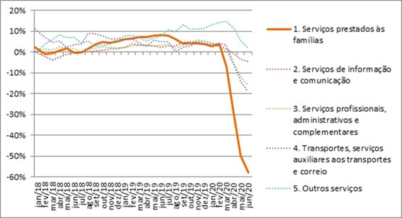 Enquanto a receita total dos serviços apresentou queda de 15,9% no 2º trimestre em relação ao mesmo período do ano passado, os serviços prestados às famílias registraram queda de 57,9% pela mesma métrica.