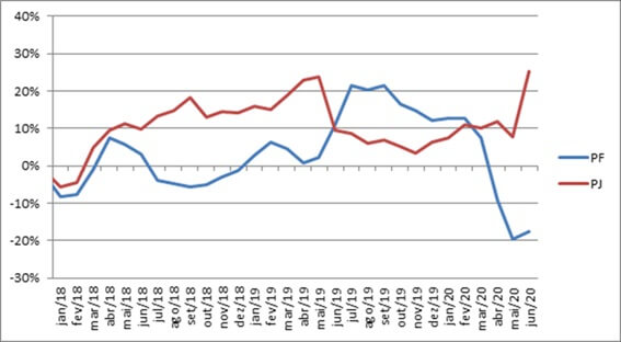 Quando a arrecadação de seguros (Susep, excluindo DPVAT) em seguros voltados à Pessoa Física (portanto mais próximo do conceito de família, usado na PMS do IBGE) e Pessoa Jurídica é desagregada, a CNseg observou um comportamento totalmente condizente com essa realidade: a arrecadação de seguros PF caiu abruptamente como consequência da pandemia enquanto os seguros voltados à PJ não chegaram sequer a sofrer retração no período. Enquanto a arrecadação dos seguros PF apresentou queda de 17,5% no 2º trimestre em relação ao mesmo período do ano passado, os seguros PJ registraram crescimento de 25,3% pela mesma métrica.
