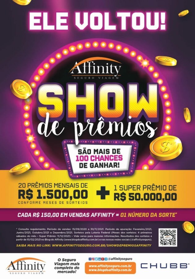 O Blog do Affinity vai postar semanalmente (nos meses de fevereiro, junho e outubro de 2021) os ganhadores de cada sorteio e uma listagem final relacionando os sorteados de cada mês. Você também pode acessar o site oficial: www.affinityseguro.com.br/showdepremiosaffinity.