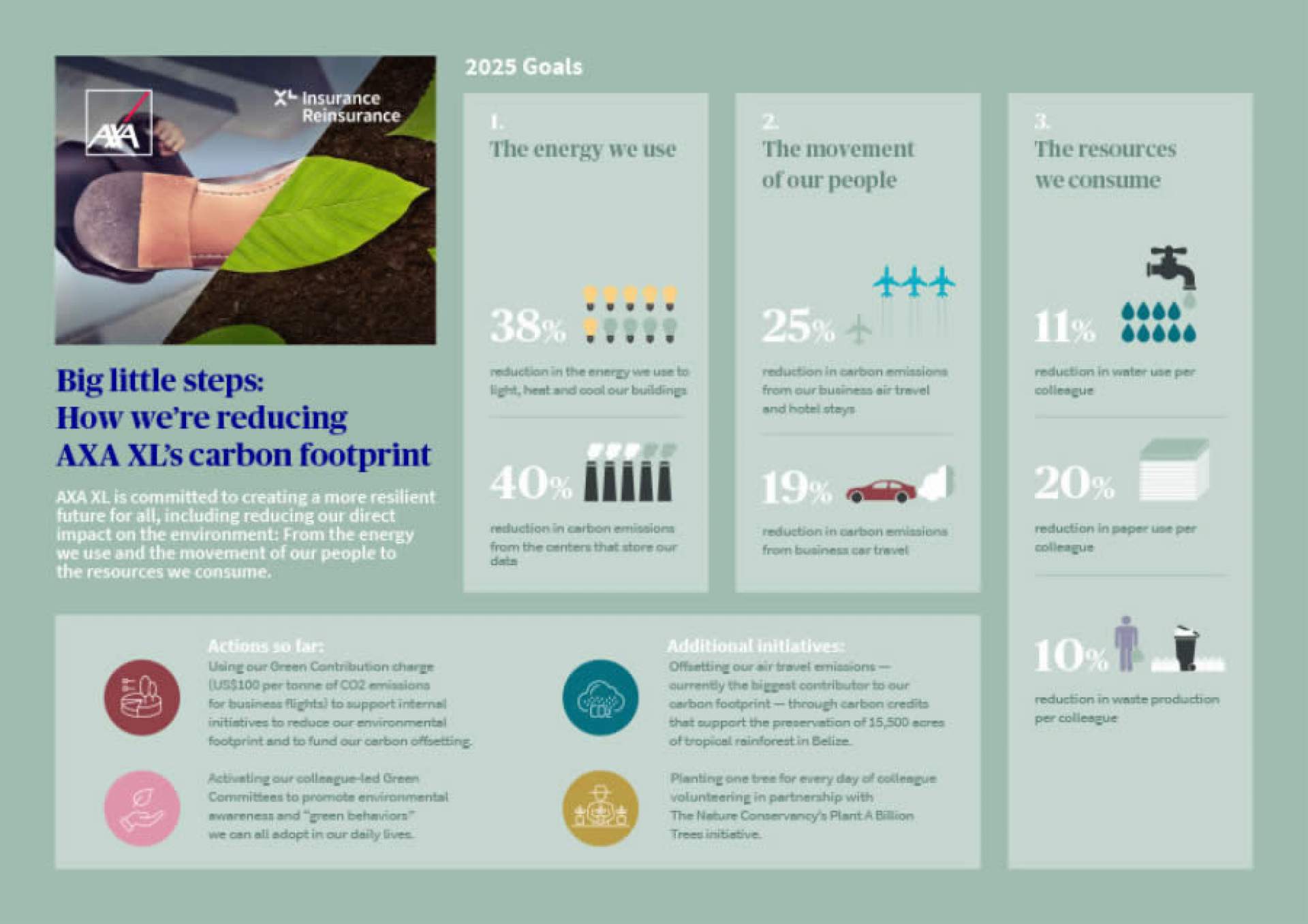 Três áreas foram identificadas como fundamentais para a AXA XL trabalhar em direção a uma meta abrangente de limitar o aquecimento global a menos de 1,5 ° C, que é uma meta alinhada à descarbonização prática da indústria. Essas áreas são consumo de energia, movimentação de pessoas (viagens e frota de veículos) e recursos consumidos.