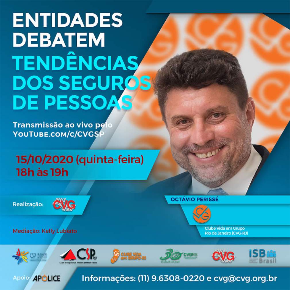 Octávio Perissé, presidente do Clube Vida em Grupo do Rio de Janeiro (CVG-RJ), participará do webinar “Entidades debatem tendências dos seguros de pessoas”. Organizado pelo Clube Vida em Grupo São Paulo (CVG-SP), o evento acontecerá em 15 de outubro, às 16h, com transmissão ao vivo pelo canal da instituição no Youtube, a ser acessado pelo link: https://www.youtube.com/c/CVGSP . A mediação será realizada por Kelly Lubiato, editora da revista Apólice, veículo que apoia a iniciativa.
