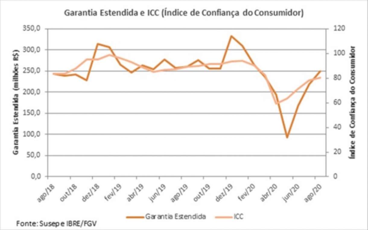 Análise da Confederação Nacional das Seguradoras, com base em dados recentes de agosto, afirma que é possível notar o efeito positivo das estratégias do governo para a abertura gradual da economia e, com isso, o Garantia Estendida já mostra sinais de recuperação. O gráfico abaixo compara a evolução do volume arrecadado pelo produto com a evolução do Índice de Confiança do Consumidor - ICC, calculado pela FGV. Pode se notar que, assim como ICC, o Garantia Estendida começa a trajetória de retorno a patamares anteriores à pandemia assim como a tendência de melhora dos indicadores de consumo. Em agosto, a arrecadação do produto já apresentou crescimento de 13,8% sobre o mês anterior.