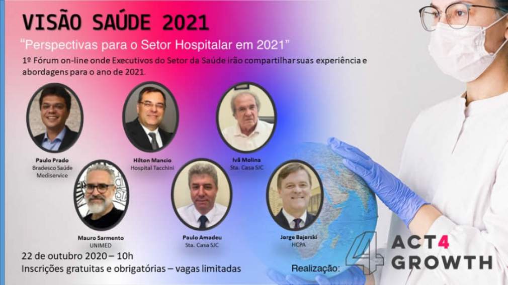 O Superintendente Executivo da Bradesco Saúde, empresa líder de seguro saúde no Brasil, Paulo Prado, participará do 1º Fórum On-line Visão Saúde 2021, com tema “Perspectivas para o setor hospitalar em 2021”, realizado pela Act4Growth Consultoria. O evento acontece na próxima quinta-feira, dia 22/10, às 10h, e também contará com a participação de Hilton Mancio, superintendente do Hospital Tacchini; Ivã Molina e Paulo Amadeu, CEO e administrador da Santa Casa Saúde de São José dos Campos; Mauro Sarmento, coordenador de inovação da Unimed; e Jorge Bajerski, diretor do Hospital de Clínicas de Porto Alegre.